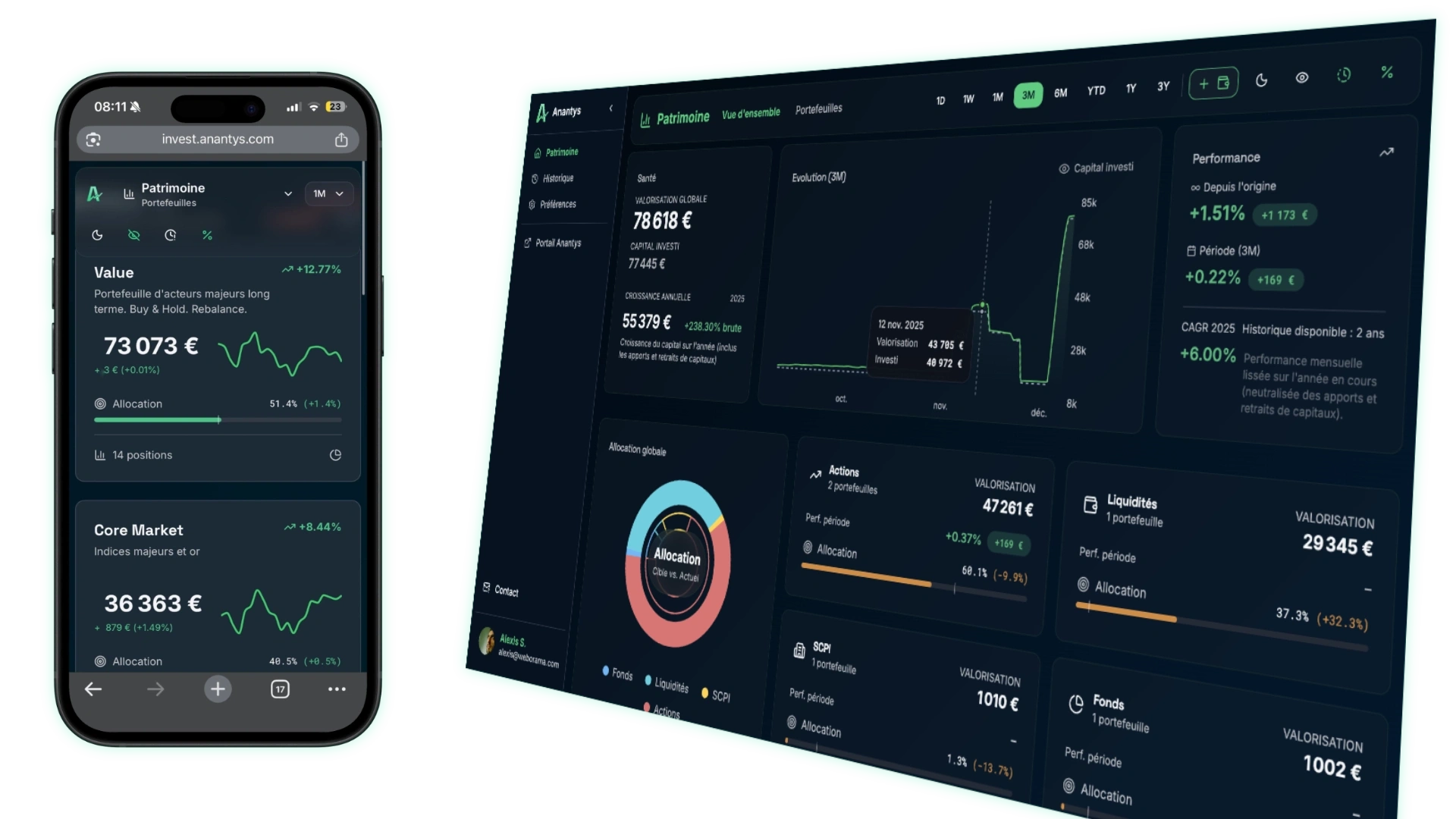 Grâce à un assistant de configuration simple, Anantys s'adapte à votre manière d'investir. L'interface est pensée pour être lisible, tactile et rapide, sur iPhone comme sur desktop.